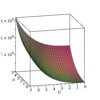plot3d(TRC(I1, I2, eval(Q2, s[2])), I1 = 0 .. 5, I2 = 0 .. 7,