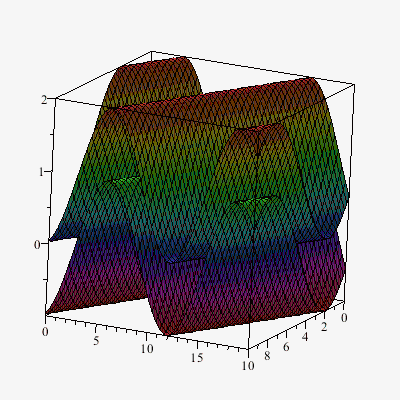 P1 := plot3d(f1, 0..10, 0..20, style=patch, shading=zhue):
