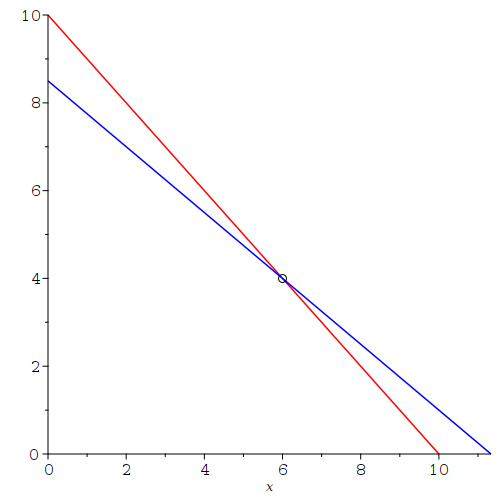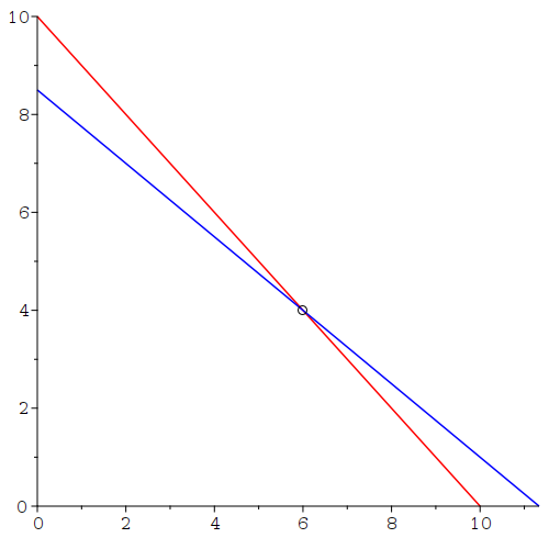 display(line([0, Y1], [X1, 0], color = red), line([0, Y2], [X2, 0], color = blue), pointplot([sol], symbol = circle, symbolsize = 12))
