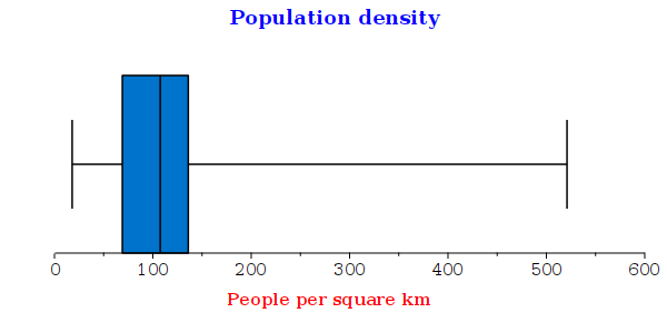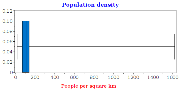 BoxPlot([B], title = `#ms("Population density",mathcolor="blue");`, deciles = false, orientation = horizontal, width = .1, view = [0 .. 1630, 0 .. .12], titlefont = [Tahoma, bold, 14], caption = `#ms("People per square km",mathcolor="red");`, captionfont = [Tahoma, bold, 12], color = "Spring_Blue", mean = false, size = [600, 300])