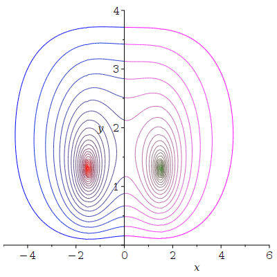 plots:-display(contplot(phi[1], x = -5 .. 0, y = 0 .. b, coloring = ["Red", "Blue"], contours = [seq(-25 .. -1)], legend = false, contourlabels = true, colorbar = false, thickness = 0, filledregions = false), contplot(phi[2], x = 0 .. 5, y = 0 .. b, coloring = ["Green", "Magenta"], contours = [seq(-25 .. -1)], legend = false, contourlabels = true, colorbar = false, thickness = 0, filledregions = false), size = [400, 400], view = [-5 .. 6, 0 .. b])