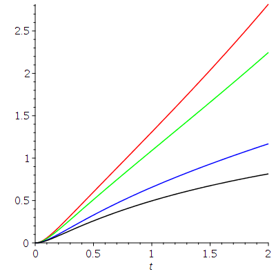 plt[j]:=plot(D[1](U)(0.00001,t), t=0..2, color=colors[j]);