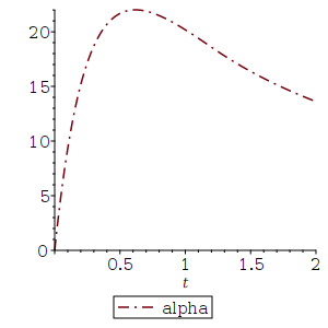 odeplot(sol1, [t, 180*arccos(cosalpha1(t))/Pi], 0 .. 2, legend = ["alpha"], linestyle = [dashdot, solid], size = [300, 300])