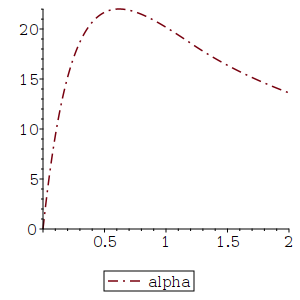 plot([t, 180*arccos(temp(t))/Pi, t = 0 .. 2], legend = ["alpha"], linestyle = [dashdot, solid], size = [300, 300])