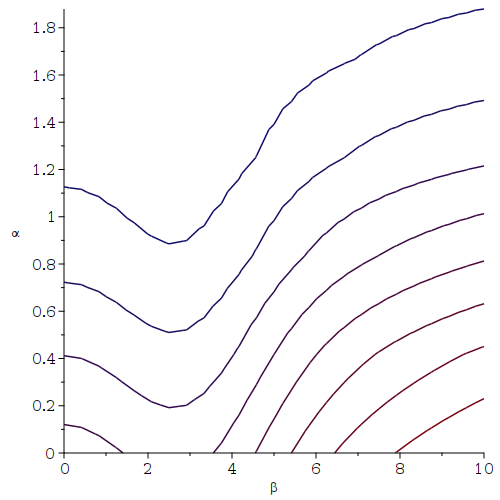 It might even be possible to improve the timing even further by parallelizing computation over a 2D Array (over beta and alpha values), and then using listcontplot.