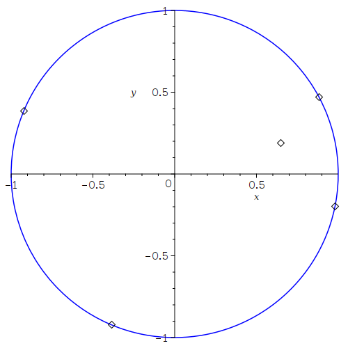 display(implicitplot([x^2 + y^2 - 1], x = -2 .. 2, y = -4 .. 2, colour = [blue], scaling = constrained), pointplot(Pts, symbolsize = 16));
