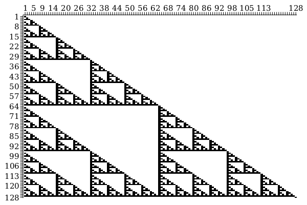 Statistics:-HeatMap(Matrix(128,(i,j)->1-modp(binomial(128-j+1,i),2)),