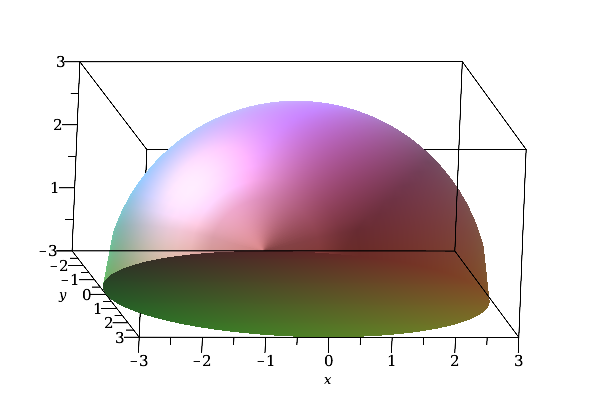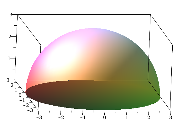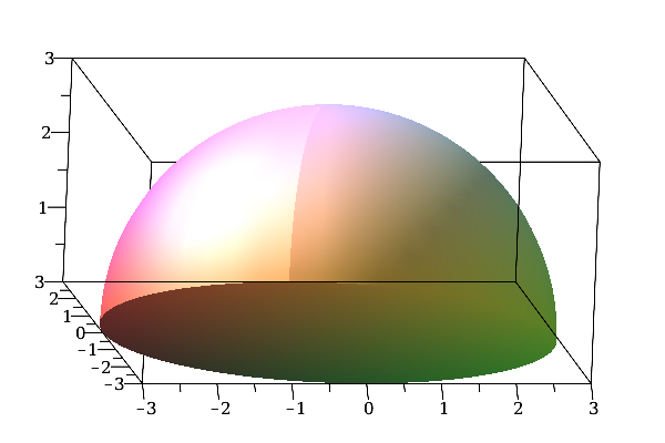 plot3d(sqrt(9-y^2-x^2),x=-sqrt(9-y^2)..sqrt(9-y^2),y=-3..3,style=surface),