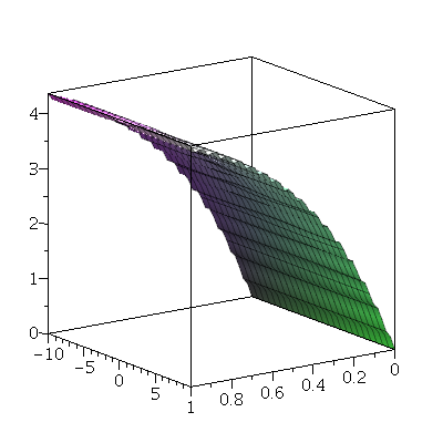 plot3d([t, delta, 'Ntd'(t,delta)], delta=-10..10, t=0..1);
