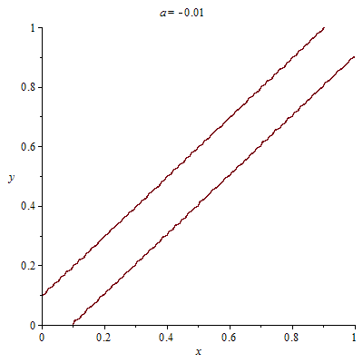 As the two parallel lines (seen when `a` is farther away from the value 0) get closer together there is a point when something curious happens.