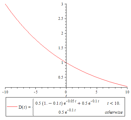 P:=piecewise(t < 10., (.50*(1-.100*t))*exp(-0.500e-1*t)