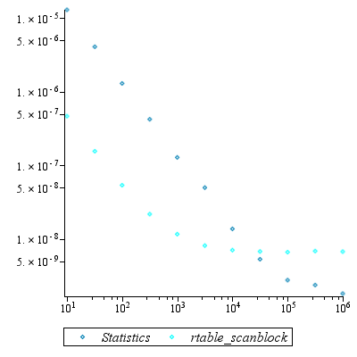 This graph shows the time per rtable entry in seconds that Statistics[Mean] and rtable_scanblock take on my developer machine in the current development version of Maple (the platform is 64-bit Linux). As you see, the crossover point is somewhere around 20000 entries. These are rtables created with the datatype=float[8] option (by calling ?Statistics/Sample , which does that automatically).