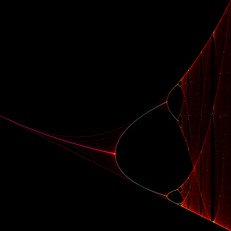 This emphasizes the first couple of iterations over the later ones, and thus shows the 'trails' better as the expression converges towards the attractor. See below. Of course iy^(-0.5) can be replaced by any other function of iy; maybe you'd want to emphasize the first couple of iterations even more, or you'd want to emphasize a few iterations around iy=500, or...