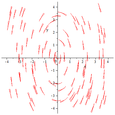 p1:=fieldplot([x/(x^2+y^2+4)^(1/2), -y/(x^2+y^2+4)^(1/2)], x = -2 .. 2, y = -2 .. 2):