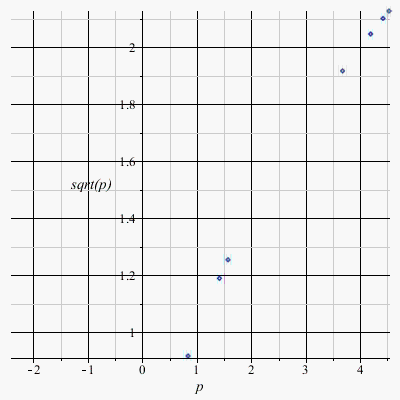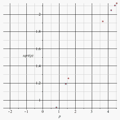 plot([ seq([p[i], q[i]], i=1..10) ], style=point, labels=['p', `sqrt(p)`])