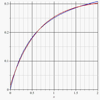 plot([f1(x), eval(f2(x), %)], x=0..2, color=[blue, red])