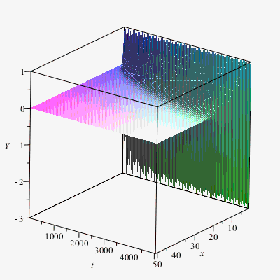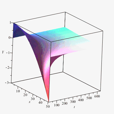 plots:-matrixplot(< Vector[column](n+1, Y0) | Y >, style=surface, labels=['x', 't', 'Y'])