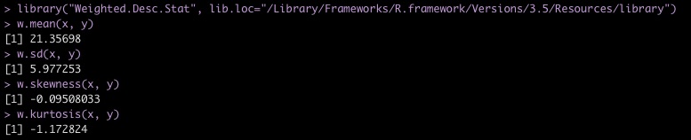 PS : For info, the R package  Weighted.Desc.Stat computes the biased estimators, not the unbiased ones (the discrepancy that exist for the biased estimators of the kurtosis between R an Maple remains mysterious)