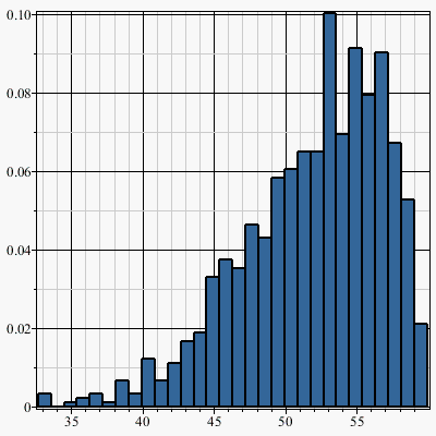 Vector(7, {(1) = mean = HFloat(21.35698070374574), (2) = standarddeviation = HFloat(6.1675934284771685), (3) = skewness = HFloat(-0.09214603163463658), (4) = kurtosis = HFloat(1.7161383756034603), (5) = minimum = HFloat(11.5), (6) = maximum = HFloat(30.5), (7) = cumulativeweight = HFloat(2643.0)}), Vector(7, {(1) = mean = HFloat(22.58333333333333), (2) = standarddeviation = HFloat(5.700003494791689), (3) = skewness = HFloat(-0.3170191063842826), (4) = kurtosis = HFloat(1.8686485006609248), (5) = minimum = HFloat(11.5), (6) = maximum = HFloat(30.5), (7) = cumulativeweight = HFloat(420.0)})