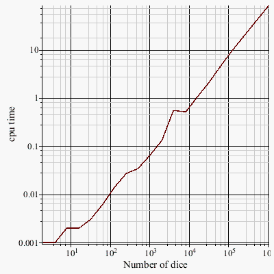 plots:-loglogplot([CPU], labels=["Number of dice", "cpu time"], labeldirections=[default, vertical])