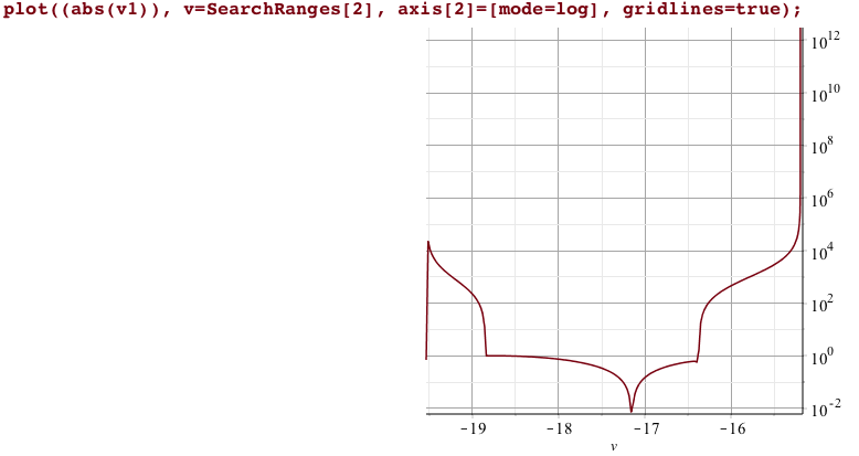 range =  15.1955 .. 19.5371 , min(abs(v1)) = 9.37714009e-10 opt[1]  at v = 17.1518