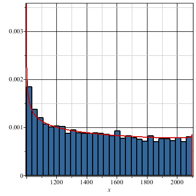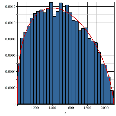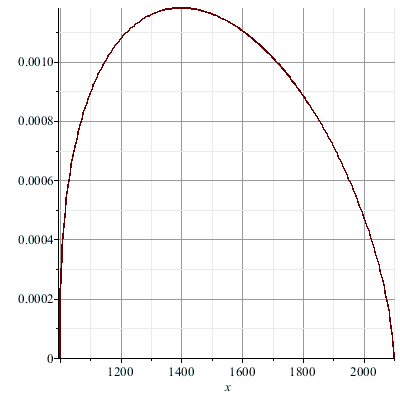 piecewise(x < 1000, 0, x <= 2100, (1/1210000)*(x-1000)^(4/11)*(2100-x)^(7/11)/Beta(15/11, 18/11), 2100 < x, 0)