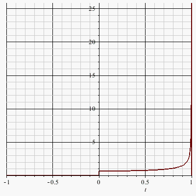 piecewise(t <= 0, 0, 0 < t, 2*t*piecewise(t^2 < 0, 0, t^2 <= 1, piecewise(And(0 <= t^2, -t^4 < 0), piecewise(t^2 <= 0, 0, t^2 < 1, (1/4)/(-t^2+1)^(1/2), t^2 = 1, (1/4)/(t^2-1)^(1/2), 1 < t^2, 0), 0)+piecewise(And(0 <= t^2, -t^4 < 0), piecewise(t^2 < 0, 0, t^2 < 1, (1/4)/(-t^2+1)^(1/2), t^2 = 1, (1/4)/(t^2-1)^(1/2), 1 < t^2, 0), 0), 0))