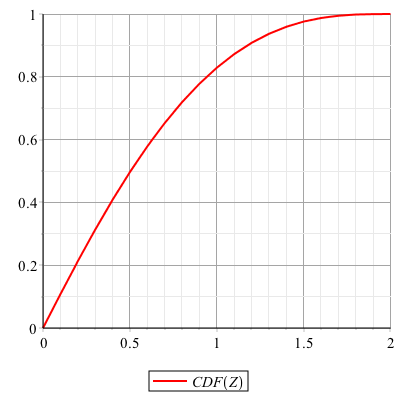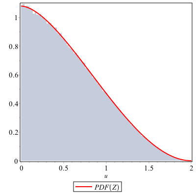 The PDF of Z has support (0, 2) and has the same shape than PDF(U, u) restricted to the interval (0, 2)... but a "vertical scale" has to be done in order that int(PDF(U, u), u=0..2) = 1. Thus the meaning of my writting f__U(u) := 2*PDF(U, u) assuming u > 0.